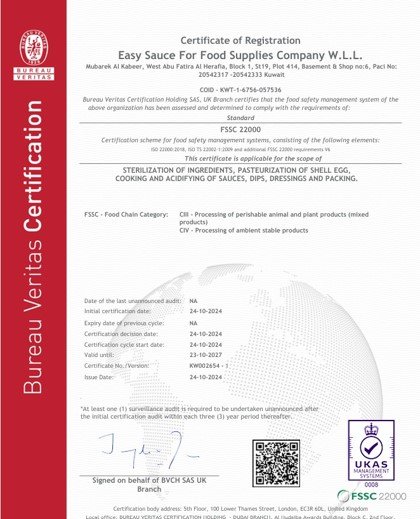 “We are FSSC 22000 V6 certified by Bureau Veritas, a leading global authority in Food Safety Management Systems. This certification reinforces our commitment to fostering a strong food safety culture and is essential for effectively managing our manufacturing operations.